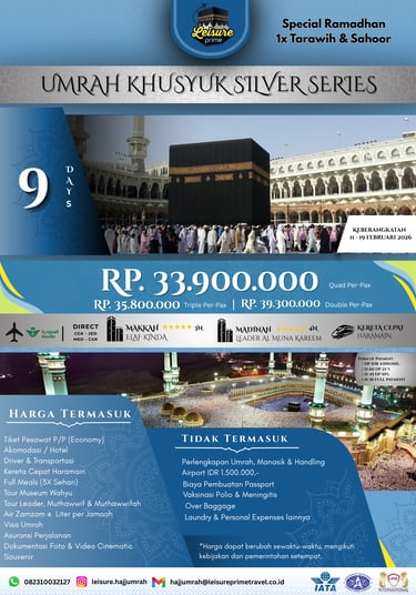 Kami dari Leisure Prime Travel, mitra perjalanan ibadah umrah yang amanah dan terpercaya. Dengan pengalaman dan pelayanan terbaik, kami berkomitmen mendampingi setiap langkah-Mu menuju Tanah Suci dengan penuh kenyamanan, keamanan, dan keberkahan.